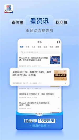1)即时价格:及时获取全国所有城市的钢贸价格,以便您做出明智的投资选择。