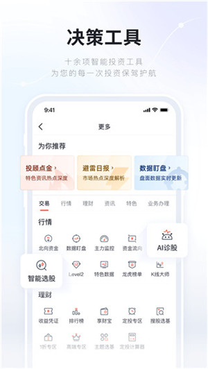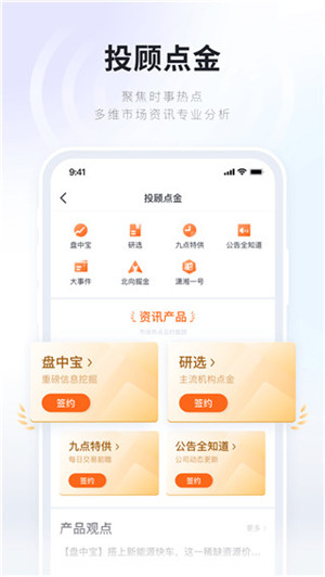 1、在线咨询更方便快捷,随时都可以进行查看了解详细的信息动态信息。2、所有的数据都能及时为用户更新记录推荐分析结果更加精准有效。3、所有客户能够在app上直接选择对应的投资方式即可享受优质的服务项目了。4、拥有非常清晰简约的设计风格让操作使用起来简单明了便捷化。5、提供的各项资产配置也都特别清楚明确且一目了然可自由的选择需要购买的产品并支付费用。6、提供了超多的股市新闻热点供您随心观看与阅读到最新的资讯文章详情互动交流学习技巧。7、全面丰富的财富管理工具帮助您的财富保值增值打造一个全新的财富管理模式。8、应用中有大量的市场研究报告版块以供大家参考获取更为全面化的决策建议指导作用。