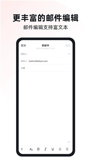 阿里云邮箱个人版是一款由阿里巴巴推出的邮件服务软件,该版本为用户提供了最新的功能体验和便捷的使用。该版本为用户的手机提供多端同步、即时通讯等实用功能,让用户随时随地轻松使用邮箱账号并进行操作。阿里云邮箱个人版采用了先进的加密技术,确保邮件传输过程的安全可靠。