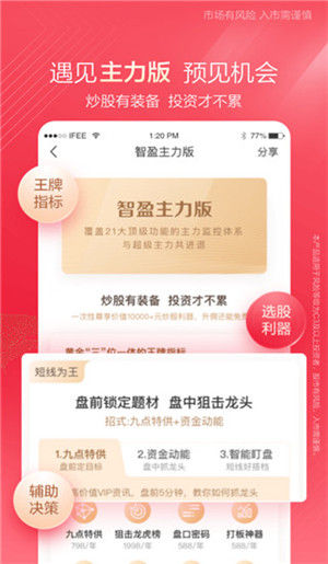 智能诊疗:基于大数据分析,智能诊断,全面了解市场趋势和涨停机会;智能盯跌:实时提醒买卖信号和涨价情况,主力动向一目了然。