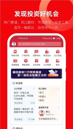 九方智投擒龙版最新版本是九才财富投资股份有限公司推出的一款智能炒股平台,该软件可以帮助用户快速捕捉牛人信号,及时了解市场动态。它不仅提供了实时股票行情和股市资讯、基金理财产品等功能,而且还通过智能化分析为广大投资者提供个性化的的投资方案建议及策略参考服务。