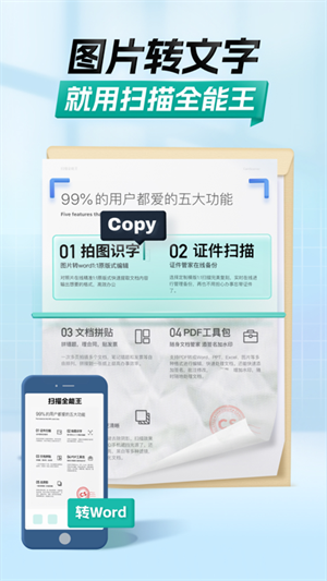 扫描全能王-OCR(光学字符识别)是集文字识别、图片转PDF、表格提取于一体的智能ocr文本识别与转换工具,能够实现图片中的表格文件精准快速准确将图片内容转化为电子表格或PDF文件,极大提升工作效率。