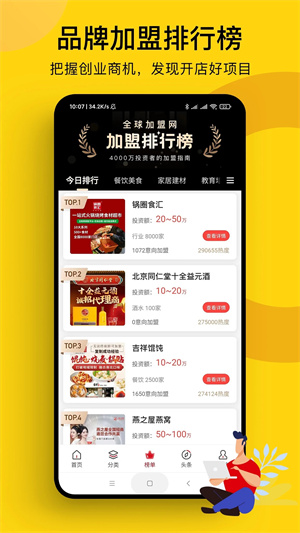 全球加盟网app是一款专注于全球领先的创新型创业服务平台,它拥有海量的优质好商机、丰富的行业信息及多样化的项目选择。这款平台不仅汇聚了全网最热、最火爆和最新的加盟政策以及各种品牌资讯动态等内容,还提供多种开店方式供用户挑选使用,让你在手机上也能轻松管理自己的店铺!全球加盟网app为广大的加盟者提供了众多实用功能和服务体验:智能推荐与个性化搜索模式等等,帮助你发现更多符合你口味的好商机