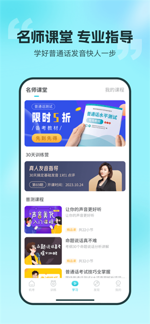 普通话测试APP是杭州欢创科技有限公司打造的一款手机普通话考试学习软件,这里汇集了海量专业的普通话练习课程资源。用户可以在线进行报名参加各种普通话测评活动哦!欢迎下载使用吧。