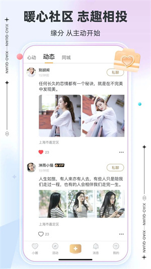 小圈app是一款专为单身男女设计的交友软件,提供丰富的社交功能和安全稳定的环境,用户可以轻松找到志同道合的人。无论是寻找爱情、结识新朋友还是建立深厚的联系,小圈app都提供了多种选择来扩大社交圈子,让用户与来自世界各地的用户一起探索世界各地,享受全新的交友体验。