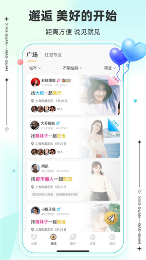 这款应用不仅是一个简单的交流平台,更是你拓展朋友圈、扩展人脉的理想伴侣。在这里,你可以随时随地发现附近的人并开启聊天之旅,分享生活的点滴,吸引更多的目光,同时还可以根据个人喜好自由筛选感兴趣的朋友或群组进行互动。此外,小圈还定期举办各种线上活动,如主题聚会、线下见面会、约会、探险等,让交际变得更加丰富多彩。