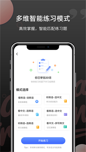 涵盖大量日常生活中的常用句子和短语,包括商务职场、旅游出行、购物消费等各类主题话题。同时还有各种实用的场景化英语会话功能让你在学习韩语过程中不断巩固所学的韩语词库。