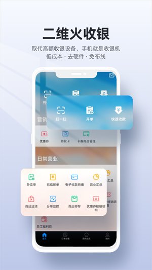 二维火收银手机版是基于安卓手机的一款移动收款应用,软件支持扫码支付、二维码点餐等功能。用户可以在线进行门店会员卡充值操作使用,随时随地轻松管理店铺订单!