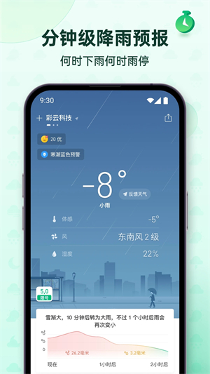 5、1分钟降雨雪预测:精准到每秒预报两地之间的差异,帮助您准确预测下一个城市何时下班,几点下不了多久~;