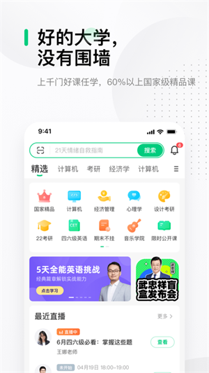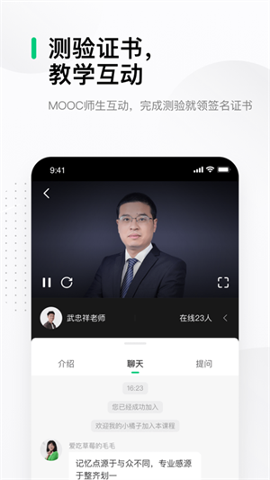 慕课网中国大学MOOC为学生提供了海量的课程视频,让每一个学习阶段的用户都能找到适合自己的专业内容。软件上的所有资源全部免费使用,用户可以随时随地在线进行选择观看和体验哦。感兴趣的朋友欢迎下载使用吧!