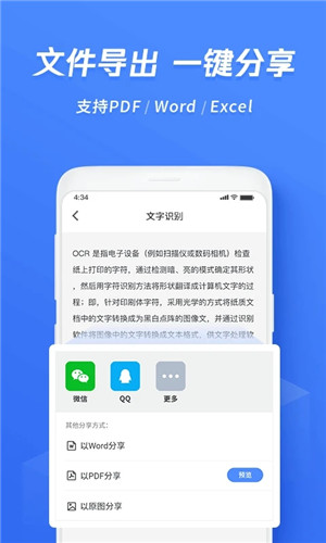 如批量识别、在线预览/离线识别、即时通讯录管理、二维码制作、人脸识别等。同时,支持多种语言互译(简体文字、繁体文字、英语文字)。