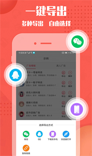 配好音!一键导出MP3和歌词到电脑上,离线播放更方便。支持蓝牙音箱播放,无需导出的文件也可以进行配音输出(mp4格式)保存到本地,多平台分享至好友或发送至朋友圈和微博。