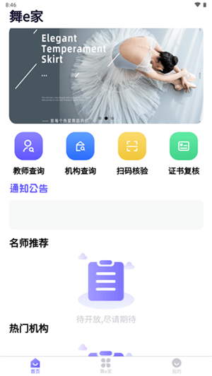 舞E家北跳跳学院使用考级同学准备一站式服务平台是专为北京舞蹈院校师生所打造的一款学习软件,该软件内提供了海量的优质教学资源和课程供用户进行选择。同时软件界面设计非常简洁直观,各种各样的教程内容都可以在这里找到!并且还能够在其中查看自己最近上课、考试成绩等详细信息哦!