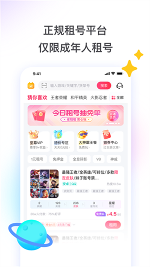 租号玩极速受欢迎的游戏账号交易平台,这里汇聚了超多热门的手游账号供您选择哦,而且在这里可以进行租赁各种账号哟,同时还可以享受到优惠活动哦,感兴趣的小伙伴快来下载吧!