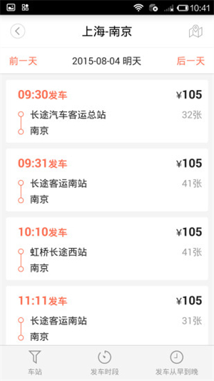 2.【汽车时刻】:输入汽车时刻后进行搜索,即可快速获取到汽车时刻的相关信息。(包括发售日期、出发日期,到终点车时刻)