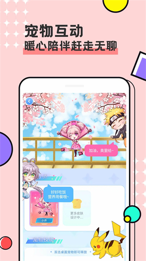 图萌宠物app是一个可以让大家在手机上养一只桌面宠物的软件,它可以帮助用户们快速地将你喜爱的人物形象和可爱的猫咪放在屏幕的左边,从而轻松与它们互动。同时软件还支持多种不同的角色供大家选择,无论是哪种风格的二次元动漫爱好者、漫画主角、游戏明星还是其他类型的角色,都可以满足你的不同口味。不仅如此,软件内还有着非常丰富的桌宠库等你来解锁哦,这些都是免费提供给大家使用的哦,欢迎有兴趣的小伙伴来本站下载使用~