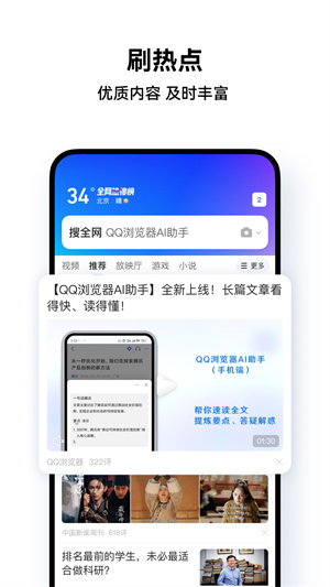 QQ浏览器软件是专为QQ手机用户打造的一款网页浏览工具,该工具可以让用户在手机上轻松打开网页。QQ浏览器软件功能强大,支持各种各样网站、新闻资讯等多种内容进行阅读;QQ浏览器软件操作简单易上手,界面清新,给用户们提供了极致的使用体验!