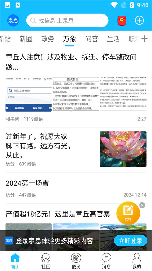 泉息app下载安装版适合每个济南的居民们进行使用,在软件内有非常多的本地新闻内容可以查看了解。每天都在不断更新最新的本地资讯和热点事件信息等等都能在这里看到;并且还能在线预约办理业务哦!需要的朋友赶紧来下载吧
