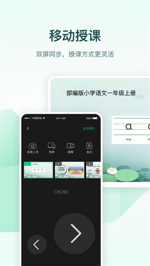 作为移动课堂产品,拥有丰富、专业的工具资源,包括:课件演示、在线批阅、知识竞赛、云账号服务。