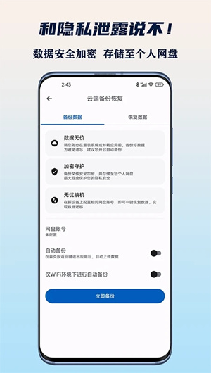 除了基本的在线保存之外,小星记账专业版还支持云端备份功能,允许用户将自己重要或重要的记事资料上传到服务器上,这样即便在更换设备时也不会丢失数据,大大提高了安全性。