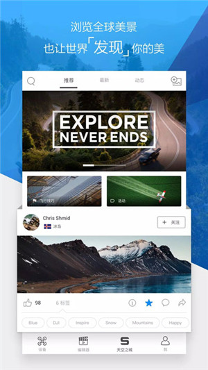 用户可以根据自身喜好自由选择适合自己使用的遥控方案以及滤镜效果供挑选以打造个性化的飞行作品。