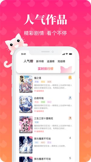 懒猫漫画APP是一个免费的漫画阅读应用,汇聚了全网的海量漫画资源。无论你喜欢什么类型的漫画,都能在这款软件中找到满足自己口味的动漫内容。而且它还支持离线下载功能,方便用户随时随地畅享漫画乐趣。同时,该软件界面简洁清晰,操作流畅,为用户带来极佳的视觉体验。