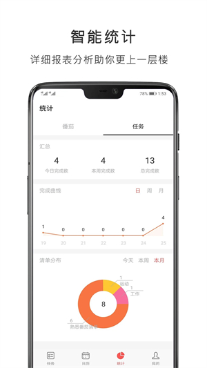番距番茄时长,让你不再担心忘记某个任务,而无需浪费太多的时间去追逐任务。番茄清单App具备强大的时间统计能力,会自动识别并提示您是否要坚持完成任务,大大提高了效率。