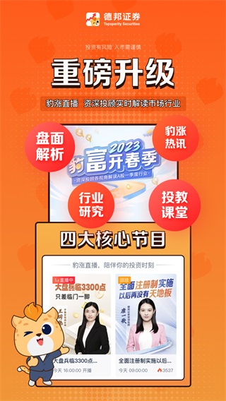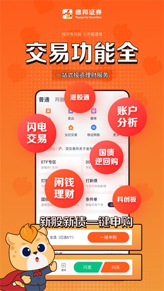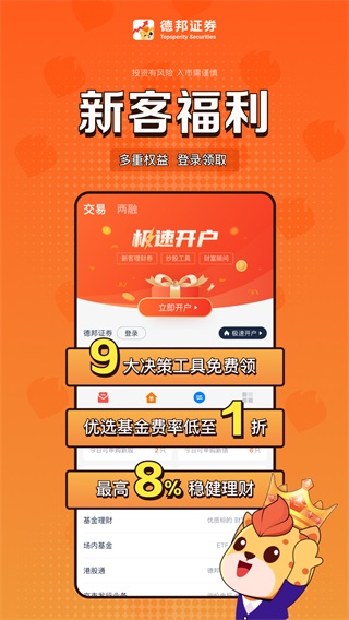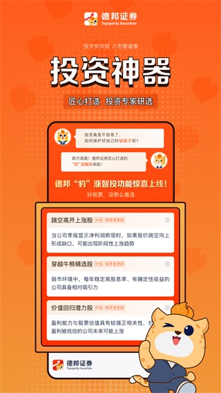 德邦证券app是上海迪克基金信息有限公司专为用户打造的一款投资理财应用,该软件拥有最先进的股票交易技术、最便捷的开户流程以及最好的客户服务。软件界面清爽简洁,功能齐全且强大实用,致力于为广大投资者提供一站式的投资解决方案和优质的服务。