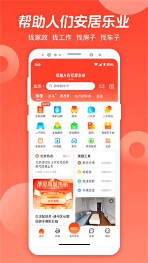 58同城招聘网app官方版包含了多种生活常用工具和服务模式,如美食外卖点餐优惠券搜索、快递查询等等。这些辅助小部件也能够更好地管理你的日常事务。
