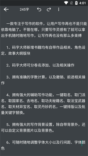 码字大师app是一款非常实用的文字创作工具,该软件可以帮助用户随时随地进行小说写作、阅读等操作。软件拥有着十分简洁明了的界面设计和强大的功能设置让用户能够在这里轻松实现自己想要写的任何作品!并且还支持多种文本格式导入并保存至本地文件当中来方便大家使用哦!