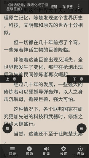 3.【舒适流畅】护眼模式、仿真等多翻页效果、文字大小调节、变换阅读背景、阅读亮度调整、锁屏时间变速播放、进度跳转、目录书签、报错功能。