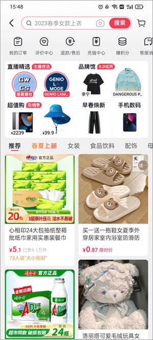 依托于阿里庞大的商品品类体系,实现精准定位和快速推荐;覆盖全品类的综合性文体百元券、潮流服饰等大牌专区,