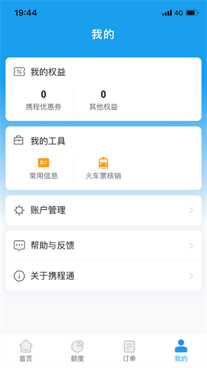4、“我的”。携程通app还提供个性化的个人定制界面设计,如主题皮肤设置、语言背景更换、快捷方式修改等实用功能模块,