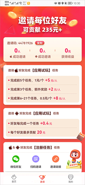 邀请好友可获得现金提成奖励。好友在本平台做任务成功即可提现,最高能提现20元/次,轻轻松松月入过万不是梦。