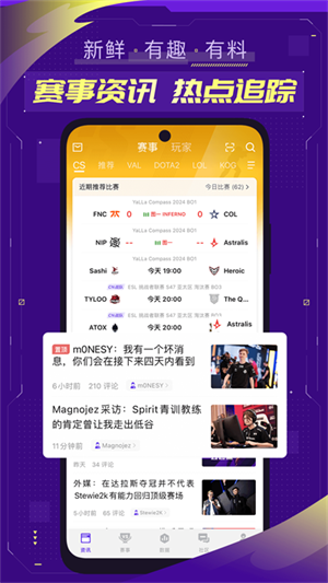 2.【赛事资料库】全面覆盖国内外各类职业篮球、足球、单机手游,包括《王者荣耀》、《绝地的战争:守望先锋》在内的全球范围内各大联赛的赛程成绩查询及战队选手资料库;