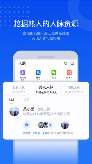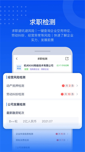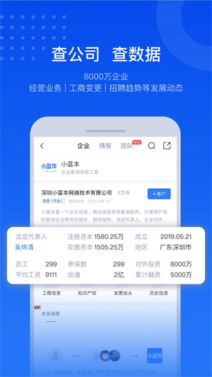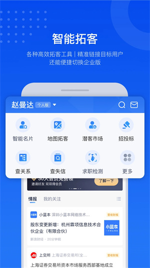 清晰的公司信息介绍(企业、老板、合作伙伴、投资人)动态实时推送,方便快捷了解公司最新情况;