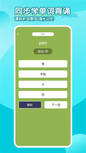 单句复读、单元跟读、自选播放、语速调节、进度记忆、生字反义词