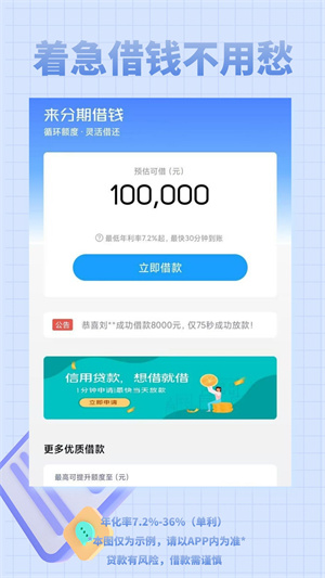 来分期借钱是一款为个人提供信用信贷服务的APP;