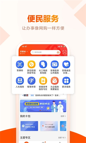 皖政通APP是由安徽省人民***主办和省委省***批准开展网上业务管理与监督的应用平台。它主要用于提供养老金查询、医保电子凭证及驾驶证记分情况查看、医考成绩查询、医疗健康档案信息填写、个人账户信息变更申请、医保账户变动登记、个人信用报告分析;同时也包含“预约挂号”、“预约取号”三大类事项在线咨询窗口;另外,该窗口还将陆续开通就诊卡、医保电子凭证(含)申领进度查询、预约挂号、医检报告单下载、健康咨询/就诊卡充值、就诊卡密码修改、医护电子券领取等应用场景,让群众通过手机就能享受到全省统一的服务体验。