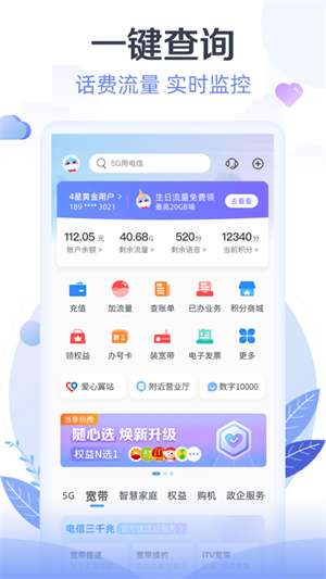 天翼生活江苏量身打造的手机电信app是一款专为江苏移动的用户提供的掌上营业厅,软件内有着海量的优质流量资源供用户使用!并且可以在线进行办理业务操作体验哦,快来下载使用吧!