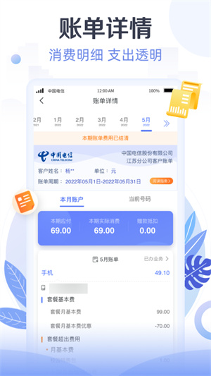 6.“我的套餐”更加丰富:账单明细详单以及资费数据轻松查看。