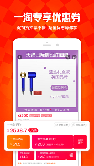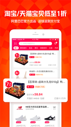 一淘App是阿里巴巴集团倾力打造的一款网购返利应用,提供海量商品内部隐藏券、内部优惠券和返佣金奖励,更有每日精选特价商品限时抢购,还有海量返现赚钱任务可完成;超多高性价比的好物在这里等待你的来发现,快来下载一淘体验一下吧~