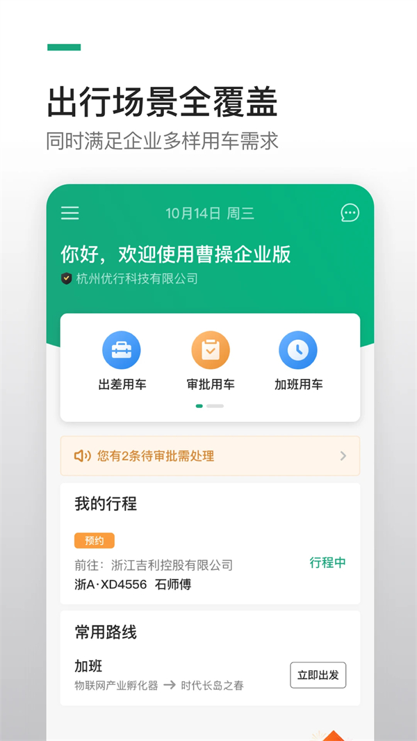 曹操企业版app是杭州优行企业用车平台,这款软件可以提供各种出行服务和专车接送功能,在吉利旗下的滴滴出租车、网约车等车型中都有对应的汽车供你选择,而且还能直接在线预订等等!