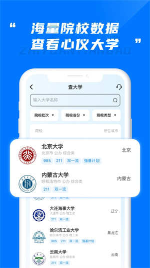 3.“查院校”模块:收录超过1500万所高校,985/211/双一流院校任你选,方便快捷找到心仪院校不再迷茫。