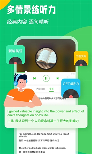 包括绘本阅读、情景对话、视频配音、英汉互译等多项强大的功能模块。