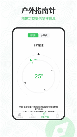 海拔高度测量仪免费版是一个非常实用的多功能应用,能够帮助您在手机上快速查询当前位置和经纬度、天气信息等多种数据。您可以使用它轻松地获取各种详细的信息资料;还提供了天气预报功能,让您可以实时了解当地的气象情况并做出相应的决策;这些服务不仅方便了用户对天气状况进行全面评估和指导,还提高了用户的生活质量。