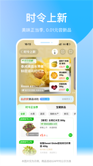 产品涵盖水果、蔬菜和肉禽蛋类。包含了休闲零食、米面粮油等全品类的食材。