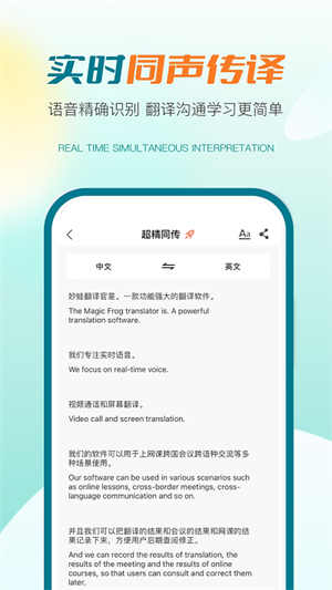 译妙蛙翻译官官方版是一个专业的语言实时在线交流软件。译妙舟翻译官支持多种语言的即时沟通功能,用户可以轻松实现文本与语音之间的相互转换操作。同时,译技蛙翻译官还提供了丰富的语种选择和实用工具帮助用户提高工作、学习效率。