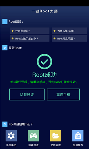 3、Root成功,请勿卸载内置自启软件,否则无法继续Root。