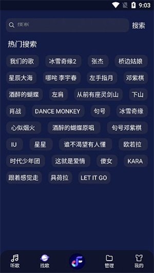 1、界面设计简洁,操作起来很简单,你可以快速进入你的音乐主页面来搜索您想听的歌曲吧。